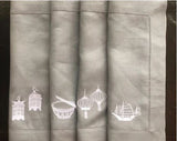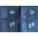 - Feature: a set of grey and navy blue linen placemats with 4 different embroidery icon (Rice Bowl, Junk, Birdcages, Lanterns), a set of golden linen placemats with Dragon